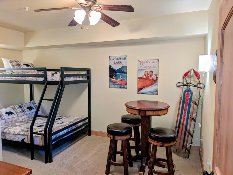 The Master bedroom is your own private retreat with a King-size bed, fireplace, walk-in closet, and ensuite bathroom. The primary guest bedroom has a comfy queen bed, and the secondary guest bedroom features a twin-over-full bunk bed with a small gaming area, perfect for kids or extra guests.